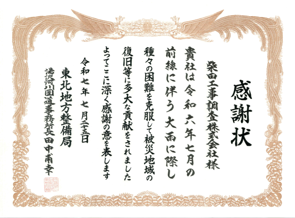 令和六年七月の「前線に伴う大雨」におきまして、東北地方整備局 湯沢河川国道事務所長 より感謝状をいただきました。