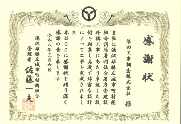 湯沢雄勝広域市町村圏組合 様より「湯沢雄勝広域市町村圏組合消防署羽後分署庁舎建設外構工事」における 感謝状 をいただきました。